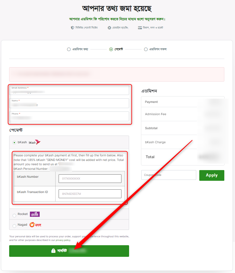 এবার আপনার ইমেইল, আপনার রিসিপশন নাম ও ফোন নম্বর দিন ও নিচের বিকাশ, রকেট ও নগদ নম্বরে টাকা পাঠিয়ে, আপনার বিকাশ নম্বর ও ট্রান্জেকশন নম্বর টাইপ করুন। তারপর সাবমিট বাটনে ক্লিক করুন