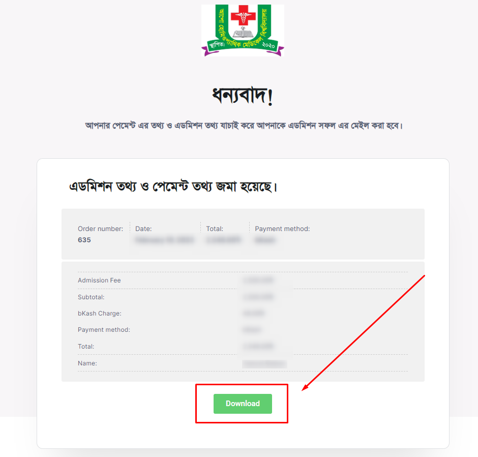 নিচের মতো পেজ আসলে বুঝবেন আপনার এডমিশন তথ্য আমরা বুঝে পেয়েছি। ডাউনলোড বাটনে ক্লিক করে তথ্য সংক্ষন করুন।